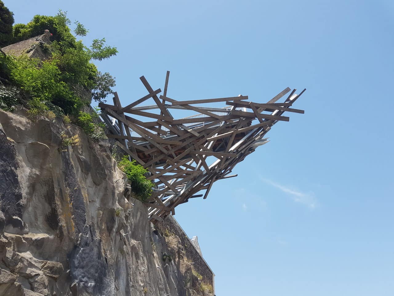 Tadashi Kawamata a imaginé le Belvédère de l’Hermitage, œuvre permanente de la collection Estuaire Nantes Saint-Nazaire. L’ouvrage s’ouvre par une étroite passerelle, légèrement en pente et enserrée de hautes palissades, qui offre une perspective cadrée sur le ciel et le fleuve. Ce cheminement rectiligne se prolonge, sans palissade, en porte-à-faux au-dessus de la falaise. Alors qu’il avance vers le vide et découvre la vue dégagée sur le paysage, le visiteur perçoit sous le platelage un enchevêtrement chaotique de poutres accrochées à la falaise qui évoque la forme d’un nid d’hirondelle.